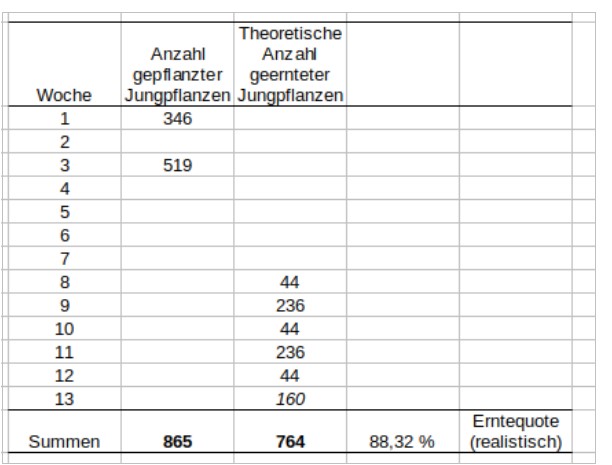 Theoretisch (siehe Tabelle oben) würden wir dann also von einem in Woche „1“ und „3“ gepflanzten Salat ab Woche „8“ insgesamt 5 Wochen lang abwechselnd für die großen (derzeit 44) und die großen + die einfachen EA (derzeit 236) ernten können, bei einer Erntequote von 88% würde man in der 6ten Woche noch 160 verteilen können. So ganz geht es also nicht auf. Die zweite Randbedingung ist, dass wir nur alle zwei Wochen von unserem Jungpflanzenproduzenten beliefert werden. Was eine Feinabstimmung auf die dritte Randbedingung schwierig macht: Der Salat wächst im Frühjahr langsam, dann Richtung Sommer schneller, dann mit abnehmender Tageslänge wieder langsamer. Die Sätze kann man also schön gestaffelt planen, tatsächlich schiebt sich die Ernte aber Richtung Mitte Juni zusammen und zieht sich dann wieder zeitlich auseinander.