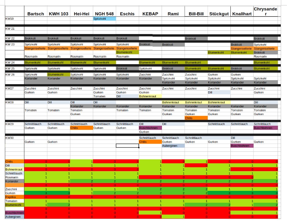 Jetzt fragt ihr euch sicherlich, wie wir den Überblick behalten, wer wann was bekommen hat. Dazu haben wir – wie könnte es anders sein – eine Tabelle. Hier wird jede Woche eingetragen, wer welches Gemüse bekommen hat, das nicht für alle reichte, und die großartige „Zählen-Wenn-Funktion“ spuckt uns eine ständig aktuelle Übersicht aus:
