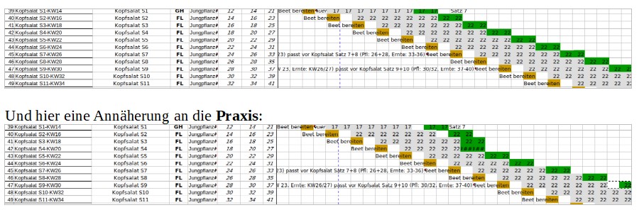 Der Salat nimmt eine Sonderstellung ein. Wir streben an, dass die einfachen EA jede zweite Woche, die großen EA jede Woche Salat bekommen. Das einzuhalten wird uns durch drei Bedingungen erschwert: Den Salat gibt es, wie alles was wir von unserem Jungpflanzenlieferanten beziehen (Salat selbst voranziehen ist im Sommer schwierig, da er niedrige Keimtemperaturen braucht) Kistenweise – 173 Jungpflanzen pro Kiste. Wir können also x*173 Jungpflanzen bestellen (Erste Randbedingung) und haben uns für das Schema entschieden, abwechselnd zwei und drei Kisten zu ordern.